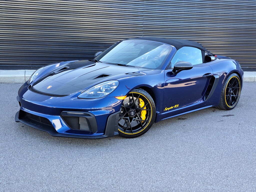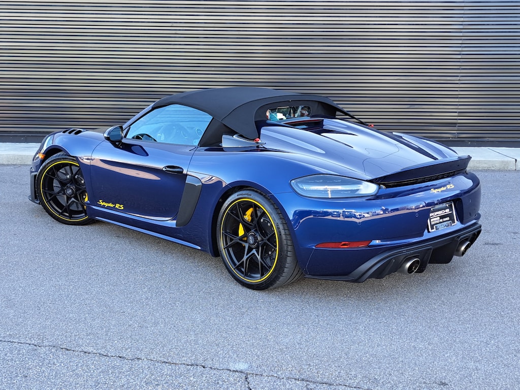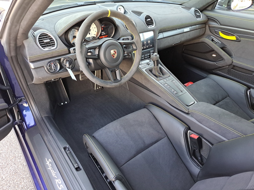 2024 Porsche 718 Spyder RS. Porsche Approved Certified Pre-Owned. 2,001 Miles. Gentian Blue Metallic Exterior. Leather/Race-Tex Interior in Black with Artic Grey Stitching. Weissach Package. Porsche Ceramic Composite Brakes (PCCB). Extended Deviated Stitching Interior Package. Front Axle Lift System. Chrono Package. BOSE Surround Sound System. LED Headlights incl. Porsche Dynamic Light System (PDLS). Accent Package Logos - Yellow. Wheels Painted in Satin Black with Outer Lip in Racing Yellow. Seat Belts in Racing Yellow. Instrument Dials in White. Chrono Stopwatch Dial in White. Door Pull Loops in Racing Yellow. Door-Sill Guards in Carbon Fiber, Illuminated. Storage Compartment Lid in Race-Tex with Porsche Crest. Fire Extinguisher. Front Trunk Lid in Exposed Carbon Fiber/Partially Painted.