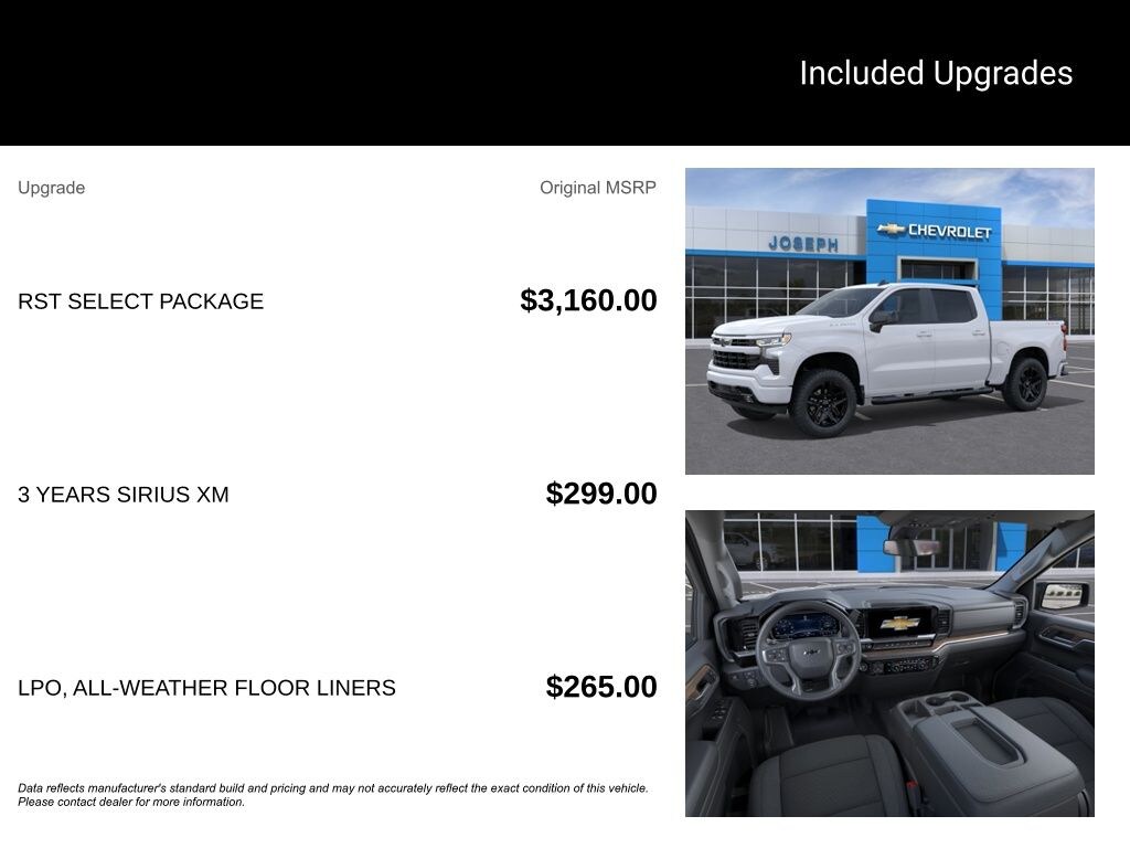 Summit White 2026 Chevrolet Silverado 1500 RST 4WD Dealer Discount of $3,356 off MSRP 8-Speed Automatic 2.7L I4 Turbocharged DOHC 16V LEV3-SULEV30 310hp 4" Black Round Assist Steps, All-Weather Floor Liner, Chevytec Spray-on Black Bedliner, High Capacity Suspension Package, RST Select Package, Wheels: 20" x 9" High Gloss Black Painted Aluminum.