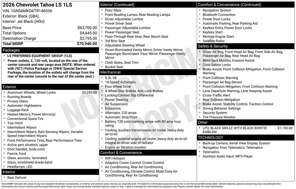 Black 2026 Chevrolet Tahoe LS 4WD Dealer Discount of $4,797 off MSRP 10-Speed Automatic with Overdrive EcoTec3 5.3L V8 8-Way Power Driver Seat Adjuster, Illuminated entry, Remote Start.